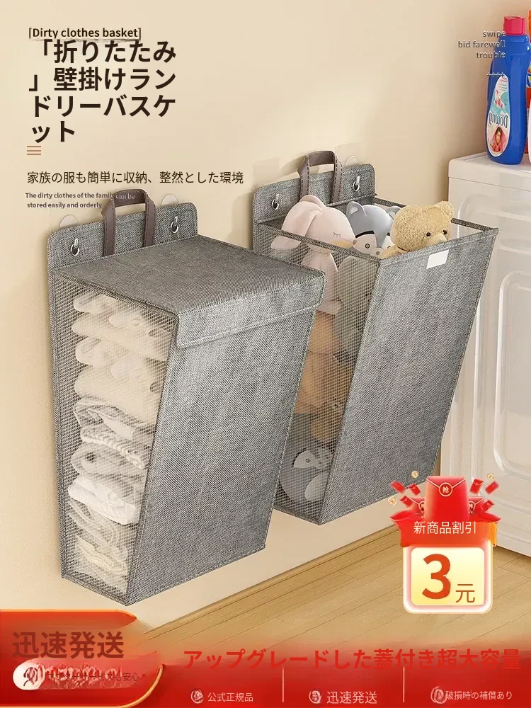 壁掛け式洗濯物収納バスケット|折りたたみ可能で省スペース!お風呂やトイレにぴったりの便利アイテム!清潔感あふれるお部屋作りに最適な洗濯物入れ。