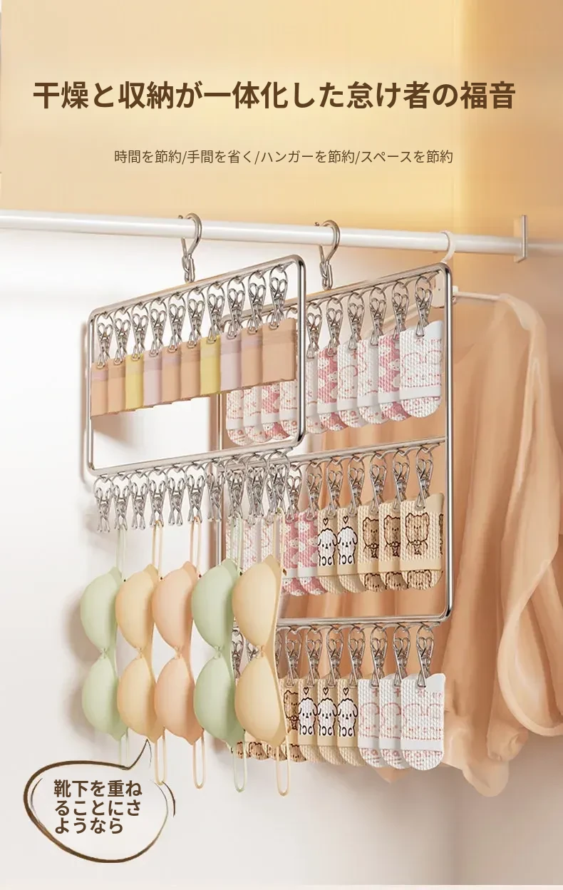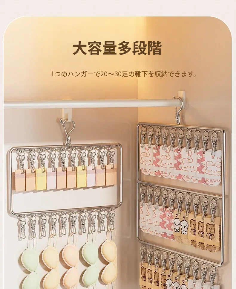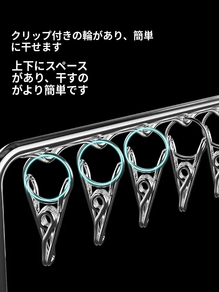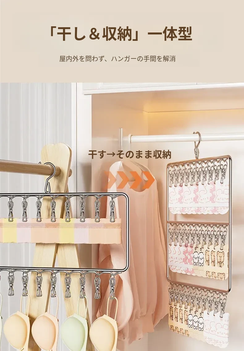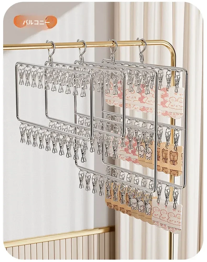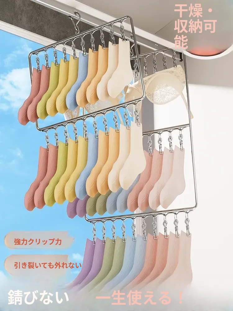 ステンレス製の多機能洗濯ハンガー!風に強く滑りにくいソックスクリップ付き。赤ちゃんの衣類や下着も安心して干せる、ママと学生に最適な洗濯便利グッズ!